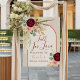 Dê as boas-vindas aos convidados com estilo com este letreiro de boas-vindas para chá de panela Fall in Love, apresentando flores de mum burgundy em aquarela, rosas cor-de-rosa, folhagens de eucalipto, penas rústicas de faisão, grama seca de pampas e sotaques de terracota laranja em um fundo bege terroso. Perfeito para uma celebração de outono moderna, boho e elegante, este letreiro inclui texto personalizável com o nome da noiva e detalhes do evento. Parte da nossa coleção Fall in Love Bridal Shower com convites, letreiros, brindes e decoração coordenados para criar um visual sazonal coeso.
