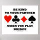 Os jogadores de ponte e os parceiros de ponte de todas as idades e níveis de experiência desfrutarão desta ponte dizendo que o poster apresenta os quatro naipes de placa juntamente com o ditado "Seja gentil com seu parceiro quando você jogar ponte". Mostre sua atitude de ponte com um conselho de ponte com este poster!