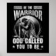 O design apresenta um poderoso guerreiro armado, ajoelhado com a cabeça curvada em reverência e obediência a Deus. O texto negrito abaixo da imagem diz, "Seja o Guerreiro que Deus Chamou Você de Ser", inspirado em 1 John 5:4, enfatizando a força e a vitória que vem através da fé em Deus.