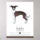 O desenho original de Destei ilustra um cão da raça Greyhound italiano, de cor casaco branca e castanha. Há três áreas de texto personalizáveis onde se poderia ser pelo nome do animal de estimação, uma poderia ser para a raça e outra poderia ser para alguns traços de personalidade. O texto é separado por uma borda de na moda, incluindo uma impressão de pata de cachorro no meio. Na parte inferior há uma linha de cor que corresponde à cor do cão.