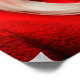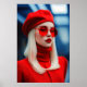 Senhora loira em macacão vermelho bereta e sombreado vermelho