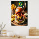 Experimente os sabores vibrantes de Salvador com esse sensacional picanha Burger brasileiro. Uma porção de carne picanha suculenta, grelhada à perfeição, é tocada com queijo catupiral derretido, cebolas caramelizadas doces e bacon crocante. Todos aninhados de dentro a um pão de brioche macio. Uma bandeira miniatura brasileira adiciona um toque festivo, enquanto um lado de batatas fritas crocantes repousa sobre uma bandeja de madeira rústica, completando essa autêntica criação culinária brasileira.