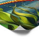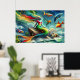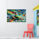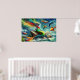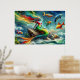 O óleo de abstrato pintou o olhar com uma foto de uma sereia de uma barbatana tópica em vermelho e verde sentado em uma rocha com o oceano e outros cinco peixes tópicos coloridos e baleias e focas ao seu redor com um céu azul. algas verdes flutuando. Este design apresenta cores brilhantes de relâmpagos dourados e uma pose poderosa .com pingos de tinta nele