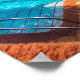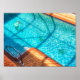 Há uma sereia na piscina de natação, juntamente com algumas outras criaturas marinhas nesta Poster. A fotografia original é uma vista de cima de uma piscina azul aqua revestida com azulejo azul marinho e terracota, e uma grade de aço curvado. A luz do sol da tarde joga sombras na água espumante. A sereia está feliz.
