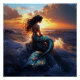 Uma bela sereia se senta em uma costa rochosa, sua cauda brilhante brilhando no pôr do sol do ouro.