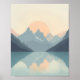 A serene and tranquil minimalist digital painting capturing the peaceful moment of sunset over a majestic mountain range and a calm lake. The design utilizes soft, harmonious pastel colors—pale pinks, gentle oranges, and various shades of muted blue—to evoke a sense of calm. The jagged peaks rise dramatically against the large, setting sun, while the still water perfectly reflects the mountains and the sky, emphasizing the atmospheric perspective and balance of the composition. This piece is ideal for modern decor, bringing a touch of nature and peace to any space.