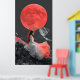 Uma jovem sentada num penhasco rochoso, olhando para uma grande lua vermelha, colocada contra um céu escuro e nublado com montanhas cobertas de neve à distância, exuando uma atmosfera serena e sonhadora.