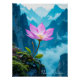 A breathtaking and tranquil scene featuring a single pink lotus flower blooming atop a moss-covered rock, its petals glistening softly with morning dew. Behind it, layers of misty mountains fade into ethereal blues and greens, creating a perfect harmony between fragility and grandeur. The gentle, diffused light evokes the quiet calm of dawn, imbuing the scene with peace and spiritual beauty. Ideal for meditation spaces, bedrooms, or any room in need of a sense of natural serenity and mindful stillness.