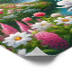 Sete cisnes flutuando num lago num belo conjunto de flores e árvores.