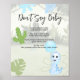 Chic e elegante Shhh não dizem "Sinal de bebê". Um sinal de jogo de chá de fraldas, com dinossauro bebê e design de balão azul. Personalize facilmente as palavras para torná-las exclusivas. Este design também pode ser usado para chá de panela, casamento, aniversário... apenas mude as palavras para corresponder ao seu evento. Visite nossa coleção de Dinossauros Azuis para encontrar bens de festa correspondentes. Napkins, obrigado cartões, sinais de boas-vindas e muito mais.