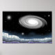 The contrast between the white of the galaxy emerging from the deep darkness and the texture of the planet's surface expresses the grandeur, solitude, and beauty of the universe.