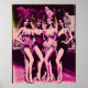 A vintage style pink and green Risograph print featuring a squad of dressed up Showgirls posing together outside of a casino.