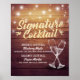 Signature Cocktail Drink Menu Wedding Decor Poster Modelo - Elegante Dourado Lettering Script, Vintage Champagne Glass e String Lights no Fundo Rustic Wood. Um Design Perfeito Para O Seu Grande Dia! Todo Estilo De Texto, Cores, Tamanhos Podem Ser Modificados Para Ajustado Das Suas Necessidades.