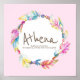 Cartaz com nome personalizado perfeito para o quarto ou sala de brincar de uma menina em tons de rosa, turquesa e marrom amarelo dourado. Personalize com seu próprio nome e significado do nome para um toque verdadeiramente personalizado no quarto ou berçário do seu filho, este exemplo é para o nome Atena Deusa da sabedoria Corajosa, astuta e inteligente. Impressão de cartaz fofo ideal para um novo bebê ou batizado ou presente de aniversário para menina. © Contas de aquarela exclusivas e arte e design de penas por Sarah Trett. www.sarahtrett.com para www.mylittleeden.com