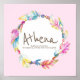 Cartaz com nome personalizado perfeito para o quarto ou sala de brincar de uma menina em tons de rosa, turquesa e marrom amarelo dourado. Personalize com o seu próprio nome e significado do nome para um toque verdadeiramente personalizado no quarto ou berçário do seu filho, este exemplo é para o nome Atena Deusa da sabedoria Corajosa, habilidosa e inteligente. Impressão de cartaz fofo ideal para um novo bebê ou batizado ou presente de aniversário de menina. © Contas de aquarela exclusivas e arte e design de penas por Sarah Trett. www.sarahtrett.com para www.mylittleeden.com