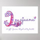 Lindo pôster com arte de monograma L personalizado perfeito para o quarto ou sala de brincar de uma menina em tons de rosa e roxo. Personalize com seu nome começando com L e o significado do nome para um toque verdadeiramente personalizado no quarto ou berçário do seu filho, este exemplo é para o nome Lajuana Um presente. Gracioso, diligente e de bom coração. Impressão de pôster fofo ideal para um novo bebê, presente de batizado ou chá de bebê ou para o quarto de uma criança. © Desenho e arte gráfica de monograma da letra L com corações e flores exclusivo por Sarah Trett. www.sarahtrett.com para www.mylittleeden.com