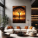 Uma paisagem serena africana ao pôr do sol, com uma grande acácia silhuetada contra o sol. A luz do ouro e a vegetação exuberante criam uma atmosfera de tranquilidade e beleza natural.