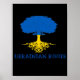 Mostre seu orgulho em sua herança ucraniana com esta poster que apresenta a silhueta de árvore enraizada em cores azuis e amarelas da bandeira da Ucrânia com texto personalizável "Raízes Ucranianas" em fundo preto.