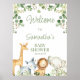 Chá de fraldas Eucalyptus Cute Safari Sinal de Boas-vindas Sinal de Boas-vindas Sweet safari com o tema chá de fraldas sinal de boas-vindas com quatro lindas cores aquáticas safari e algumas folhas verdes de eucalipto. Esse safari animal e o cartaz do chá de fraldas foliar é uma forma doce de saudar os hóspedes a um chá de fraldas de safari neutro por gênero.