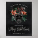 Um símbolo de boas-vindas do chá de panela do Dia das Bruxas, chique assustador, com uma ilustração tropical do crânio floral, tocada com flores laranja e peludas e folhagem verde da selva, num fundo negro enfumaçado. Personalize este único e elegante sinal de chá de panela do Dia das Bruxas com os detalhes do seu evento em caracteres não brancos. Disponível como download digital ou impresso profissionalmente.