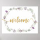 Frame de Flor Roxo com "bem-vindo" em sinal de boas-vindas em ouro para casamentos, chás de fraldas, chás de panela, etc. Ver a coleção para outras variações.