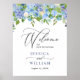 Bem-vindos convidados para o seu casamento com Blue Hydrangea Floral Greenery Chic Wedding Poster de Boas-vindas, com uma cor aquosa verde botânica e flores brancas, com "bem-vindos a nossa felicidade para sempre", seus nomes, e data de casamento em uma mistura chic de blocos modernos e letras caligráficas manuais.