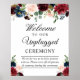 Adicione um toque de elegância à sua cerimônia de casamento com este Sinal de Cerimônia de Casamento Floral Unplugado do Marinho Burgundy. Este sinal exclusivo apresenta uma combinação espantosa de designs florais de burgundy e marinho, acrescentando um toque de charme de vintage ao seu dia especial. Quer você esteja tendo um casamento tradicional ou moderno, esta placa é uma forma excelente de lembrar seus convidados de estar presentes e apreciar a cerimônia.