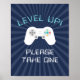 Convide os hóspedes a agarrarem um favor ou um saco porreiro na festa de aniversário temática do jogo de vídeo do seu filho com esta placa retrorreflectora legal que inclui uma controladora de jogos de vídeo num fundo azul de marinho com letra digital vintage. "Alcance! Por favor, pegue um" aparece em aqua e letras brancas.