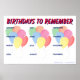 Nunca mais esqueça o aniversário de um parente ou amigo! Escreva as datas de importantes aniversários no espaço alocado, e poste esse símbolo colorido em um lugar proeminente. É melhor do que um calendário, que tende a ser jogado fora no final do ano. Este sinal bonito e decorativo pode permanecer postado à vista, ano após ano, para facilitar a consulta. Quando você ganha novos amigos e parentes, apenas adicione seus nomes e aniversários aos outros. Este poster deve ser bom para muitos anos de uso!