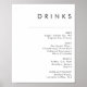 Este cartaz de bebida minimalista moderno é perfeito para o seu casamento clássico. Seu design simples, único e abstrato, acompanhado de um roteiro mínimo contemporâneo e de uma paleta de cores brancas e pretas dá a este produto uma sensação de luxo formal elegante enquanto permanece simplista, boêmica. Mantenha-o como está ou escolha personalizá-lo com trabalho de arte ou gráficos de sua escolha. Você também pode procurar outros produtos dentro desta coleção para juntar todo o seu casamento!