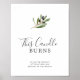 Esta azeitona moderna que esta vela queima o símbolo do memorial de casamento é perfeita para um casamento de boho. O design rústico, porém elegante, apresenta folhas botânicas de cor aquática simples e azeitonas pretas num pequeno galho com um toque mediterrânico clássico.