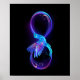 Símbolo luminoso, roxo e infinito com beija-flor azul voadora, luminosa, em fundo preto. Neon.