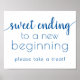 A moderna princesa de cobalto azul e branco floresce a caligrafia horizontal "Doce Acabando com o Novo Começo", chá, festa ou sinalização de mesa de recepção com um roteiro divertido e casual, escrito à mão. O clássico design inclui uma moderna camada de tipografia de citações feitas à mão. A bela fonte com uma cor de fundo personalizável facilita o ajustado de qualquer tema. Para outras cores ou produtos correspondentes, visite a loja justFharryn Zazzle ou entre em contato com o designer, c/o fharryn@yahoo.com Todos os direitos reservados. #zazzlemade