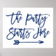 Este sinal diz "A Festa Começa Aqui" em uma tipografia de pincel elegante em azul-marinho.