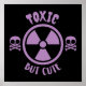 Este design tocável apresenta um símbolo de aviso roxo flanqueado por dois crânios e bósforos com a frase TOXIC MAS CUTE em texto estilizado divertido. Etiquetas: tóxicas, bonitas, roxas, advertências, crânios, ossos cruzados, símbolo, radioativo, veneno, radiação, perigo, humorístico, engraçado, texto, design