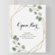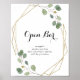 Esta placa de bar aberta de caligrafia geométrica dourada é perfeita para um casamento rústico. O design apresenta ramificações botânicas verdes, desenhadas à mão, de eucalipto e folhas adornando uma elegante estrutura geométrica.