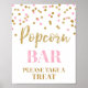Sinal de bar de pipoca para chá de fraldas, chá de panela, festa de aniversário ou casamento em rosas claro e padrão de confete de ouro. Observe que o efeito de brilho é apenas efeito fotográfico.