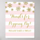 Obrigado por passar pelo sinal de poster da barra de pipoca para chá de bebê, chá de noiva ou casamento em padrão de listras rosa claro e branco com flocos de neve dourados para celebrações de inverno.