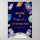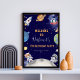 Design do espaço exterior admirável, com design de aquarela com foguetes, planetas, estrelas e animais da floresta de astronauta giros, um guaxinim e um urso com este design cósmico acrescenta um toque lúdico e imaginativo à sua celebração.