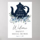 Dê boas-vindas aos convidados com este lindo cartaz para o chá de noiva, com um bule de chá azul-marinho e "Chá para o momento com a noiva" em letra divertida. Com folhagens e flores azuis. Adicione o nome da convidada de honra, data do evento e texto de boas-vindas personalizado usando os campos fornecidos.