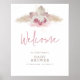 Este sinal de chá de bebê é exótico, elegante e sofisticado. Esta linda coleção está cheia de vida, calor de uma praia ensolarada em um lugar distante. Folhas de palmeira boho chic, rosas cor-de-rosa e flores brancas adicionam um toque elegante a esta coleção.