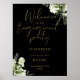 Este elegante sinal de boas-vindas da festa de noivado floral preto e dourado com folhagem botânica pode ser personalizado com suas informações em tipografia sofisticada. Criado por Thisisnotme©