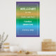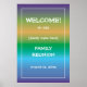 Sinal de boas-vindas da Reunião Familiar no fundo azul verde mesclado colorido. Texto totalmente personalizável para personalizar para seu evento familiar. Poster pode ser pendurado na parede ou na porta, ou montado no conselho ou no cavalete na entrada da sua festa.