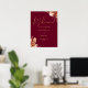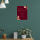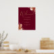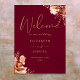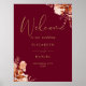 Este sinal de boas-vindas de casamento floral rústico elegante pode ser personalizado com suas informações em tipografia dourada sofisticada em um fundo borgonha. Criado por Thisisnotme©