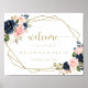 Este sinal de boas-vindas de ouro floral é perfeito para um casamento rústico. A design apresenta belas flores azuis escuras pintadas manualmente, azuis, marinhos, rosa, pinceladas, douradas e folhagem verde. Faça esta poster com o nome da noiva e do noivo, e a data do casamento.