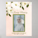Este lindo sinal de boas-vindas de funeral floral elegante com flores brancas, uma foto de seu ente querido em moldura verde, seu nome e datas de vida. O fundo deste memorial Em memória viva é rosa bege pálido.
