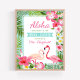 Cartaz de boas-vindas para chá de panela apresenta dois lindos flamingos rosa com uma moldura exuberante de folhas de palmeira verdes e flores tropicais de hibisco em tons de rosa vibrante, amarelo sol e branco. Texto estiloso Aloha com título em faixa azul aqua pode ser totalmente personalizado para o seu evento e o nome da noiva. A cor do fundo é azul / verde espuma do mar.