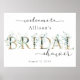 Sinal de boas-vindas de chás de noiva com letras douradas e folhas de eucalipto em aquarela. Personalize com seu nome e data.