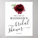Sinal de boas-vindas para chá de noiva apresenta uma única flor de rosa vermelha intensa borgonha em aquarela. Tipografia clássica e script utilizada.