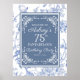 Elegante Regency Blue, sinal de boas-vindas de aniversário floral. Basta editar o texto como quiser! Bem-vindos a uma celebração da elegância do eterno e beleza refinada! Nosso Sinal de Boas-vindas de Aniversário Floral de Regência Azul acena os convidados para um mundo de sofisticação e charme. Adorado com delicados motivos florais em matizes azuis, este sinal define o palco de uma ocasião inesquecível. Como os entes queridos se reúnem, são abraçados pelo prazer gracioso do design, prometendo um dia cheio de risos, amor, e memórias queridas. Que este signo seja a bela introdução a uma celebração de aniversário tão cativante e encantadora como os próprios honrados.